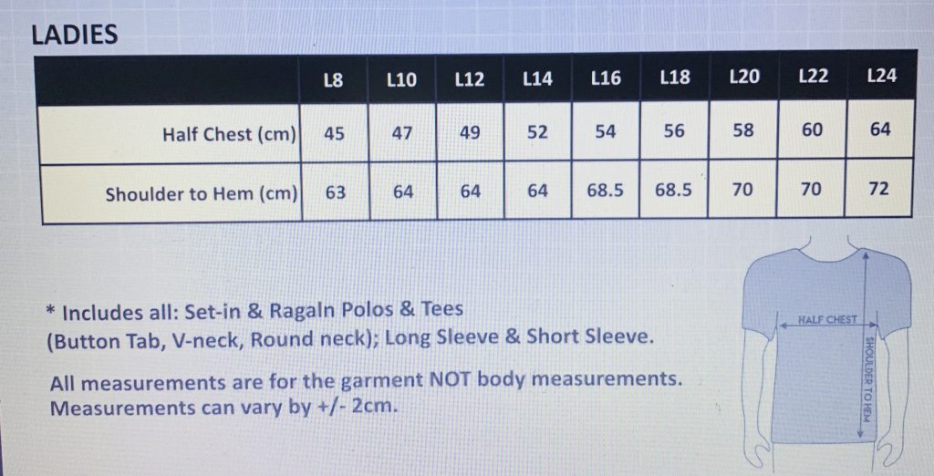 Size charts for garments are from the manufacturer of the garment not from RLNA.